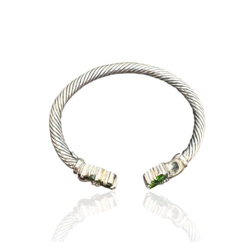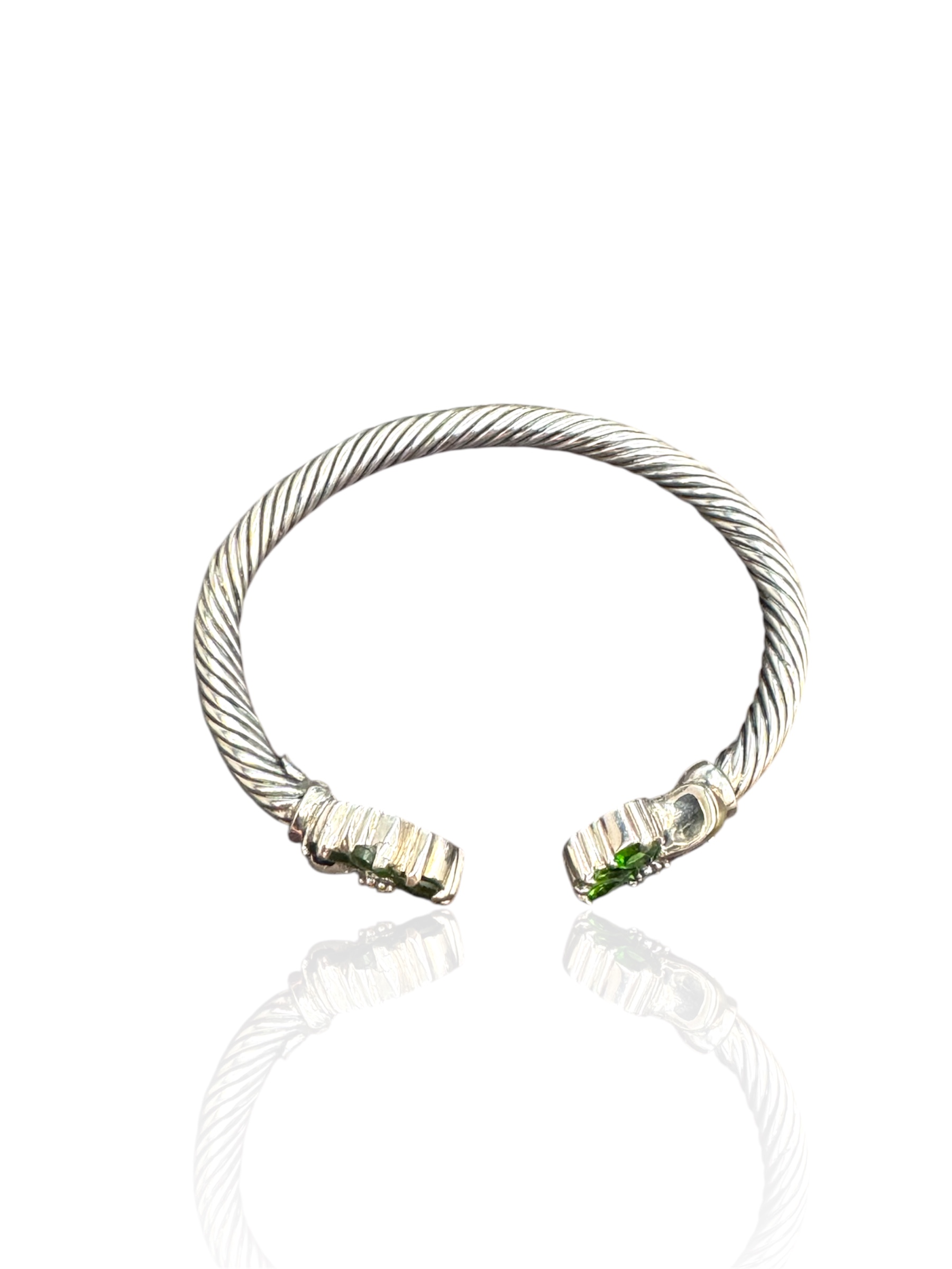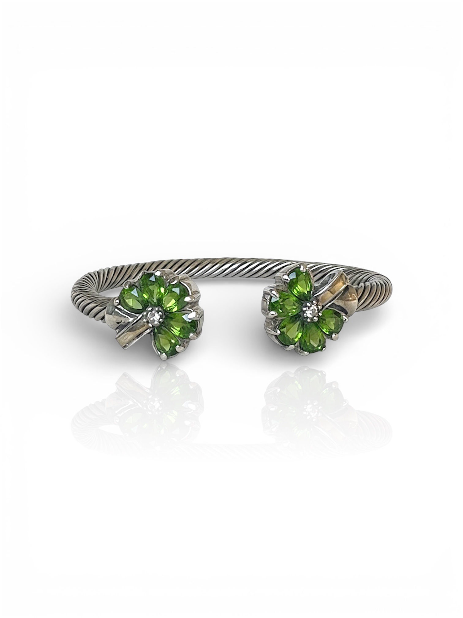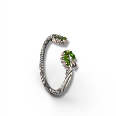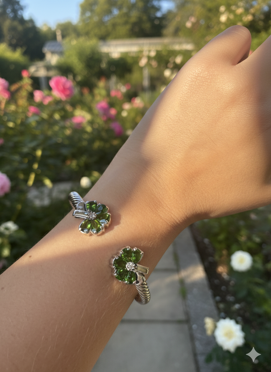 Each end of the bracelet is finished with a flower-inspired cluster of vivid green cubic zirconia, carefully set to reflect light and add a fresh, luminous touch. Designed as a fixed open cuff, this bracelet maintains its shape while offering a clean, sculptural silhouette.