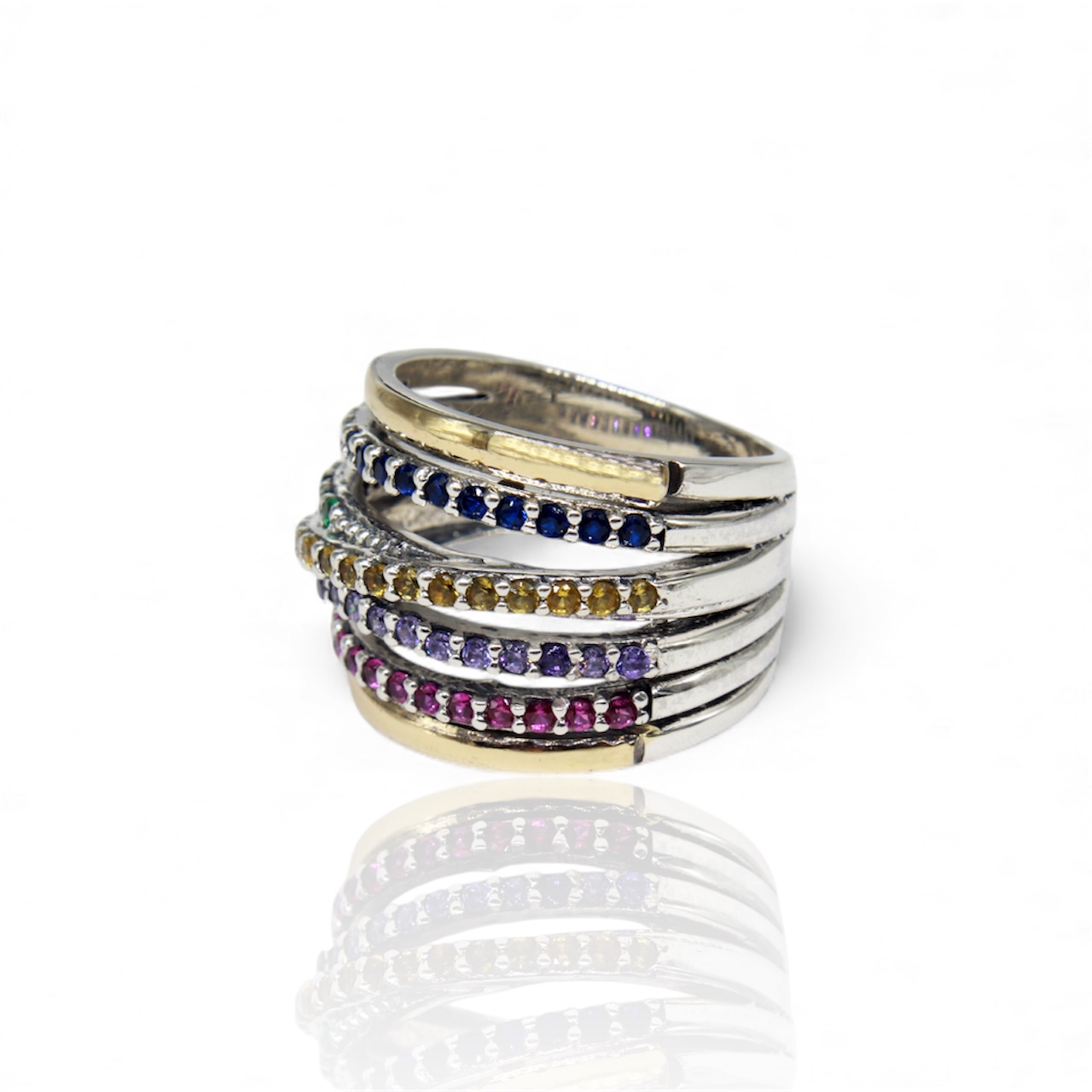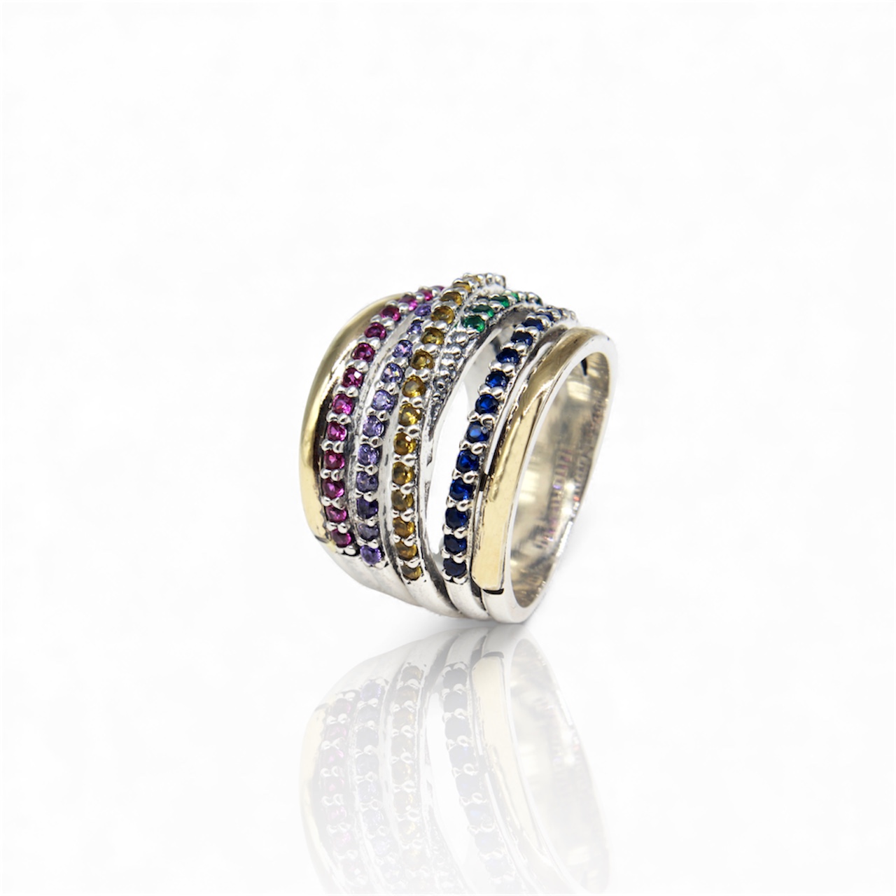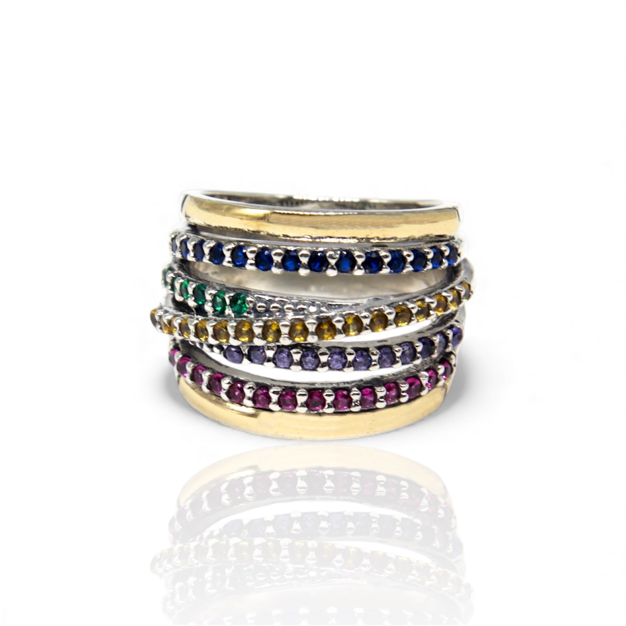 Crafted in 925 sterling silver, this multicolor ring features rows of high-quality cubic zirconias in vibrant tones, creating a bold yet refined look. Subtle gold-plated accents add warmth and contrast while maintaining a balanced, sophisticated finish. Designed to be worn alone or stacked, this piece brings color, elegance, and versatility to any jewelry collection.